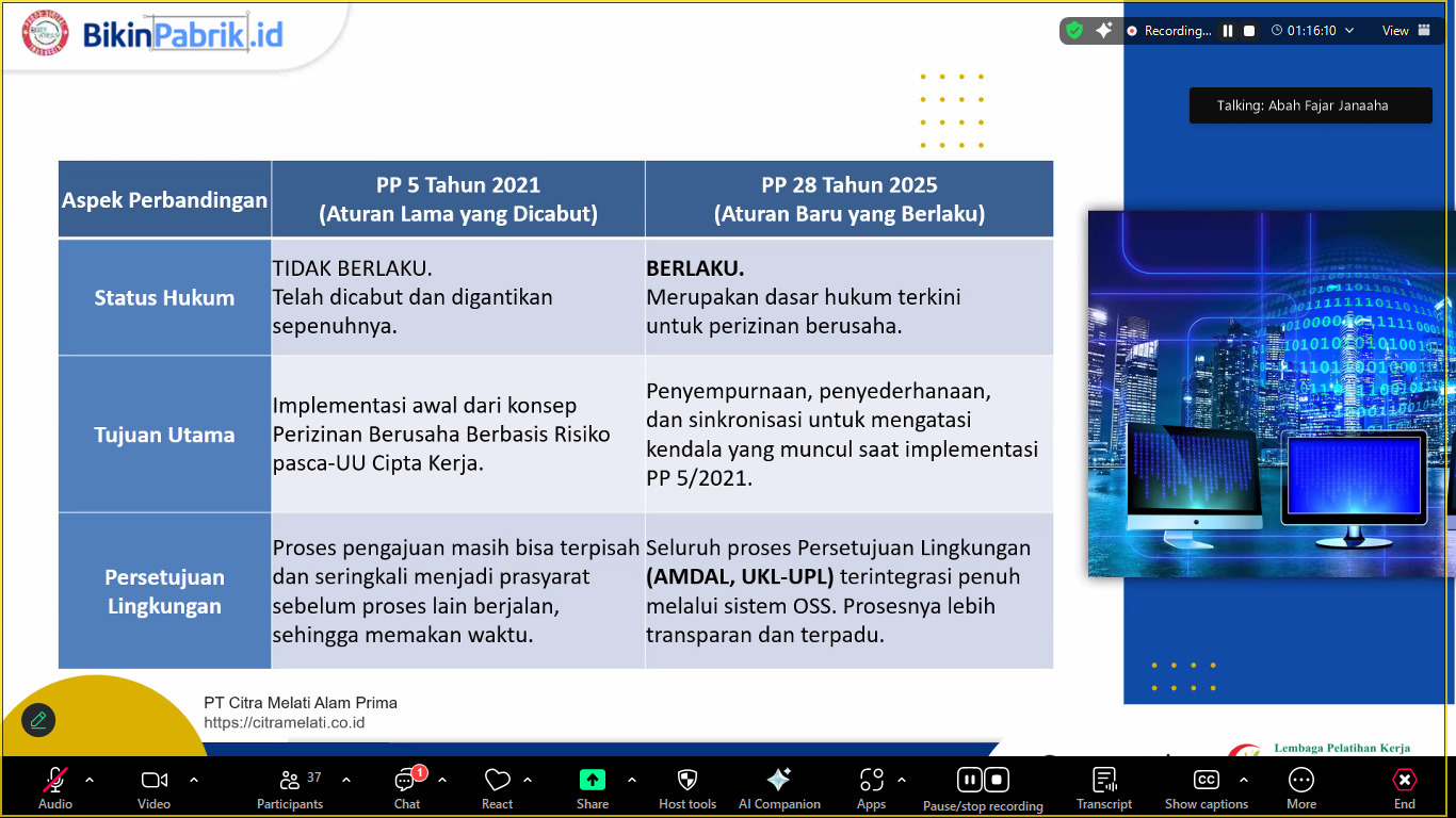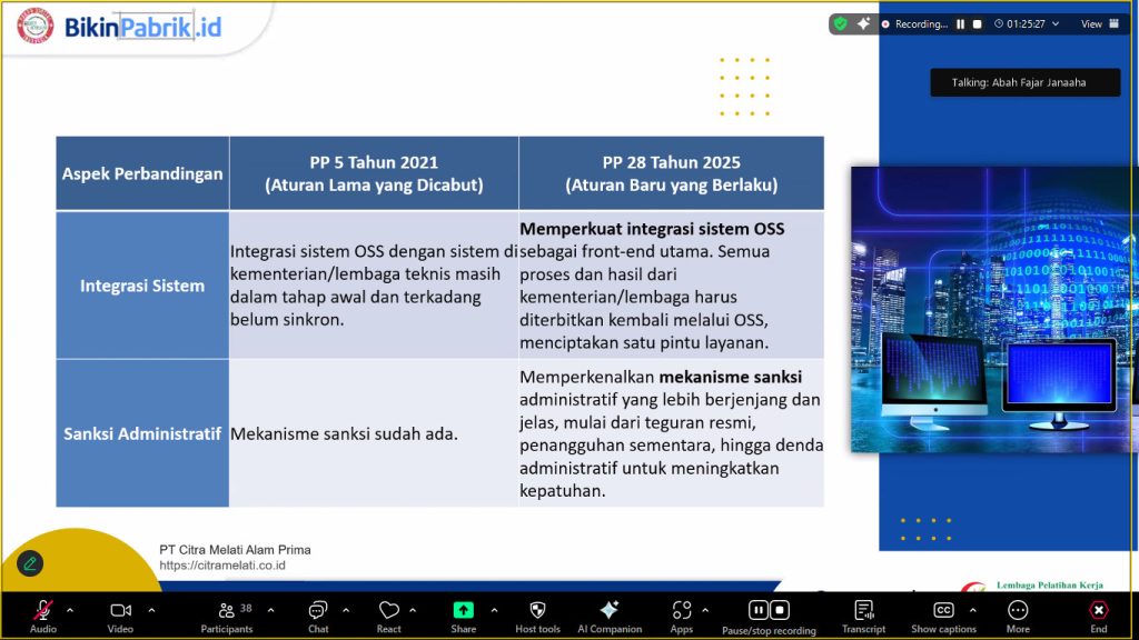 Pembahasan selanjutnya seputar Peraturan Pemerintah No.28 tahun 2025 tentang Penyelenggaraan Perizinan Berusaha Berbasis Risiko di Indonesia. PP ini menggantikan PP Nomor 5 Tahun 2021. Tujuannya untuk menyederhanakan proses perizinan, meningkatkan kemudahan berusaha, dan mendorong pertumbuhan investasi. Selain itu memberikan kejelasan sanksi jika terjadi pelanggaran atau penyalahgunaan izin.